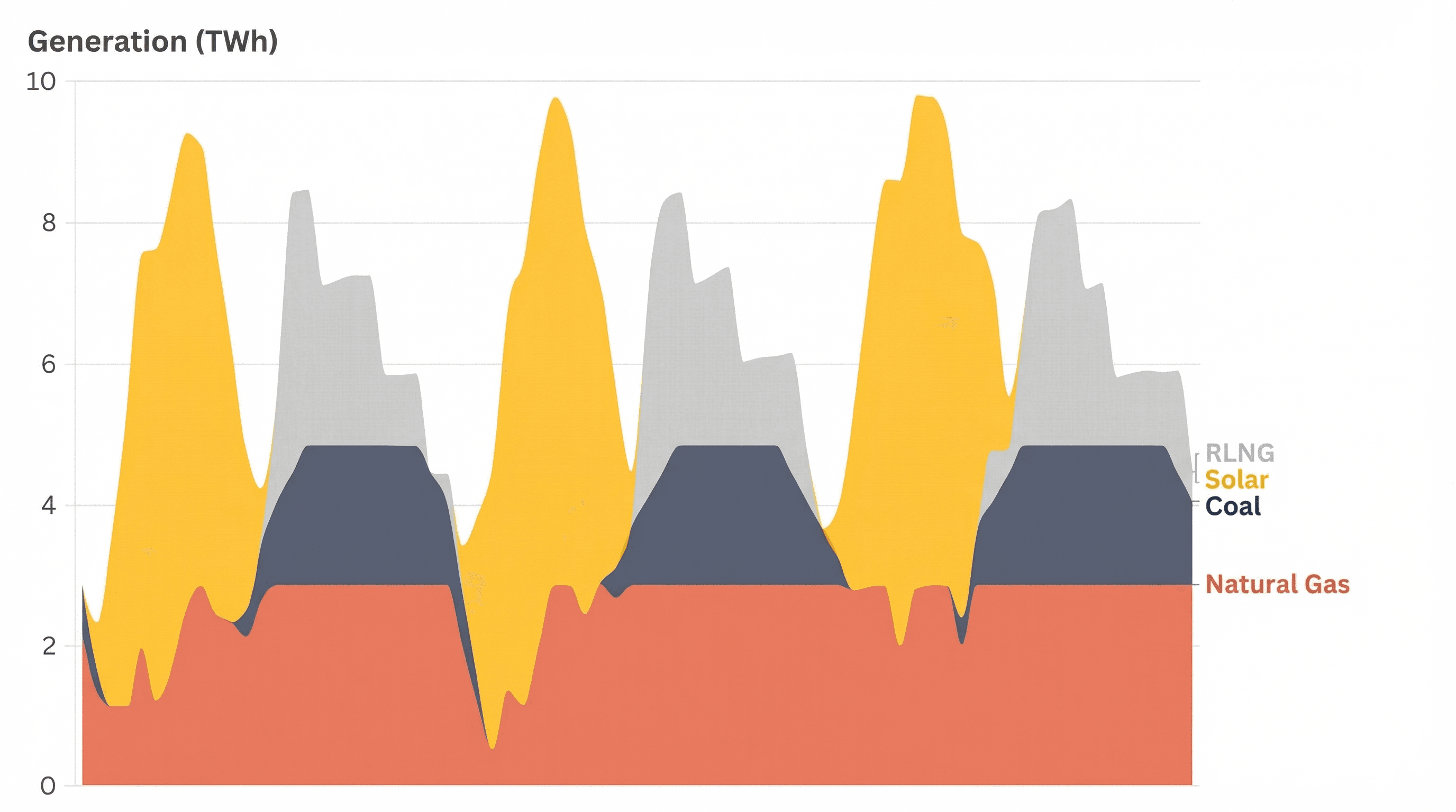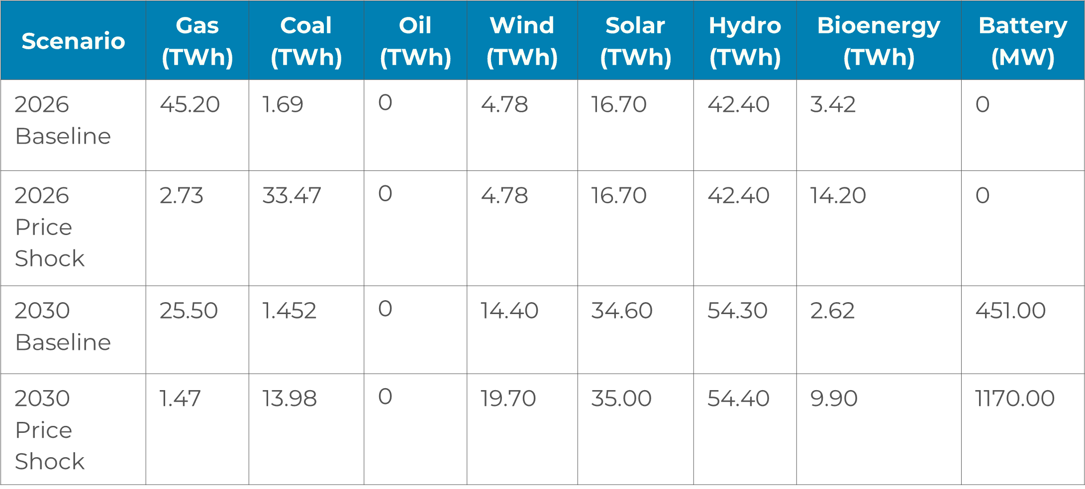 When the price shock hits, RLNG generation falls by 94%, from 45.2 TWh to 2.7 TWh. The grid, however, does not turn to oil, which is already too expensive to run. Instead, coal surges from 1.7 TWh to 33.4 TWh, absorbing the bulk of the RLNG shortfall.