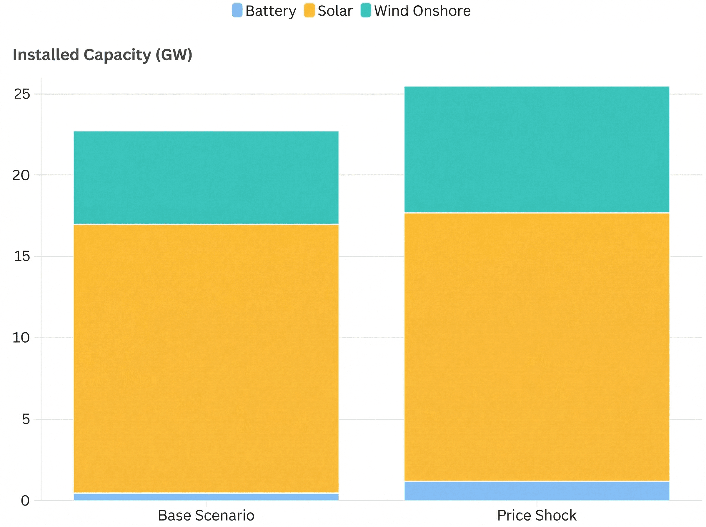 Faced with the same price shock, the 2030 system responds by investing in 1,165 MW of batteries and 2,056 MW of new wind.
