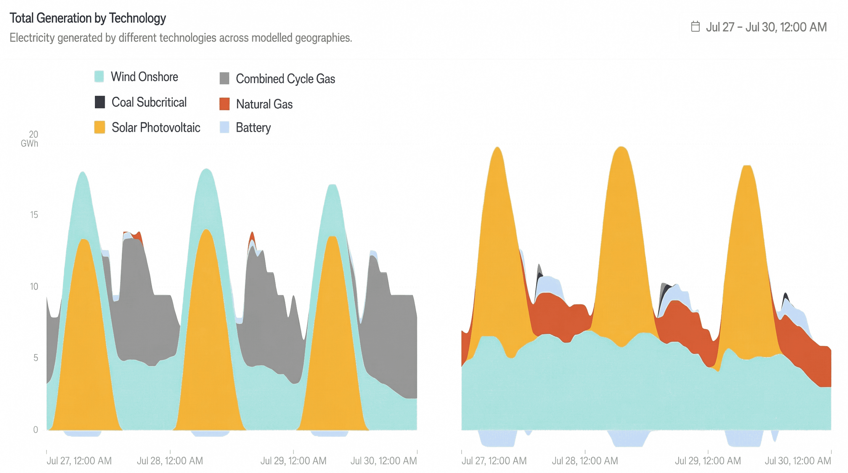 Against this backdrop, two outcomes emerge. In 2026, a price shock collapses RLNG generation by 94% and, with no grid-scale battery storage, the grid has no clean alternative in the evening hours. Coal surges from 1.7 TWh to 33.4 TWh, driving total variable costs up by US$610m and emissions up 68%. By 2030, we allow the system to respond to this price shock, resulting in: US$488m of battery and wind investment which absorbs the bulk of the RLNG shortfall, cutting its operating costs from US$3.09bn to US$218m. While coal still enters the mix, it is at a fraction of the 2026 scale.