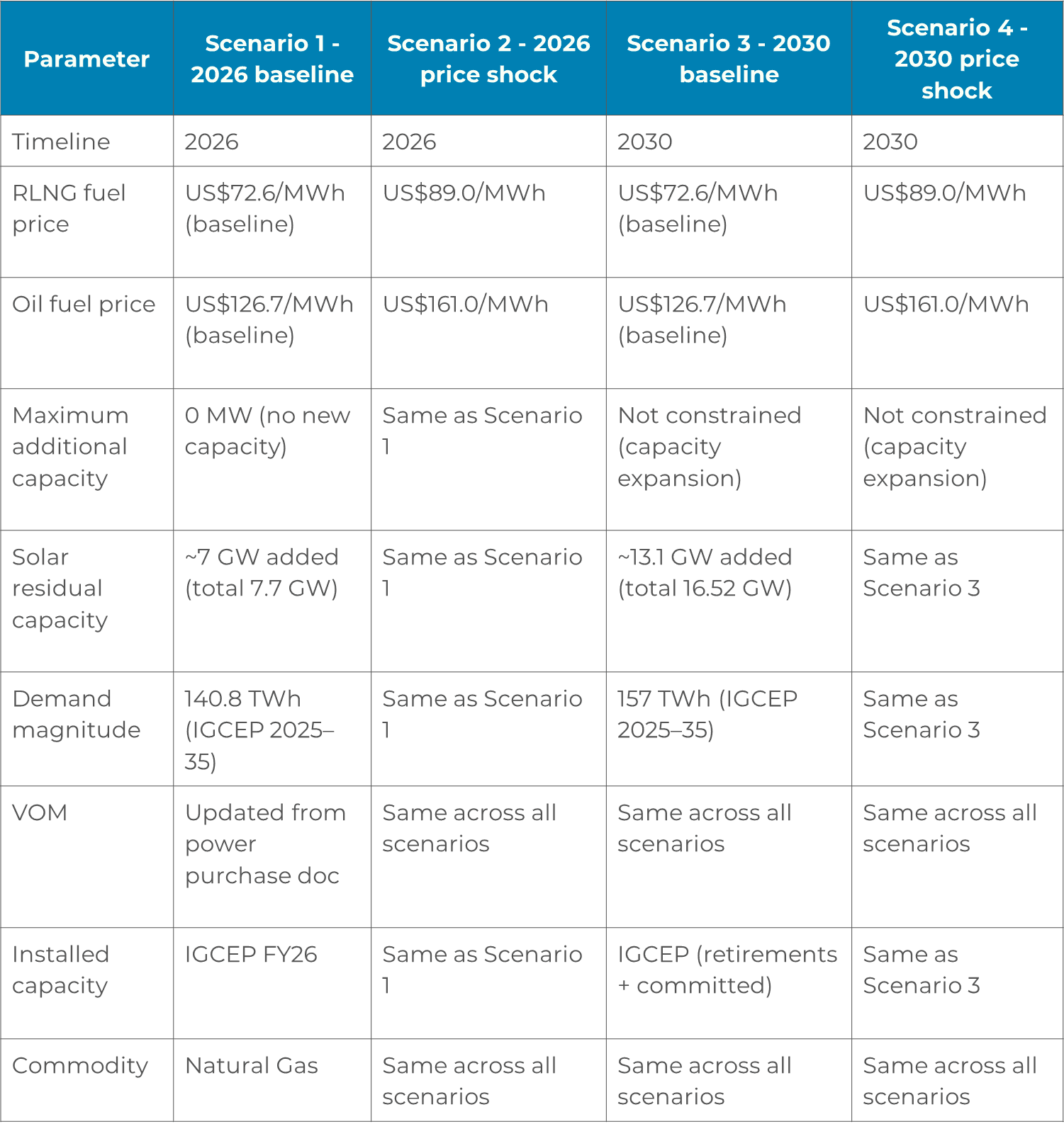With these limitations in mind, we focus this analysis on the national grid: what happens when fossil fuel prices spike in the short and medium term? Using IGCEP demand projections and locally sourced fuel prices from Pakistan's power purchase documents, we model system response in 2026 and 2030 under a combined oil and RLNG price shock.